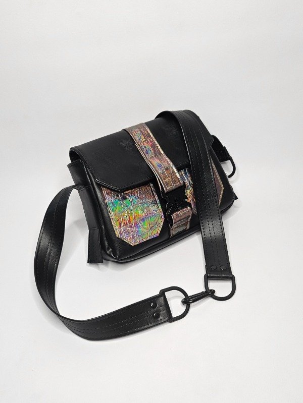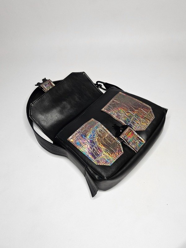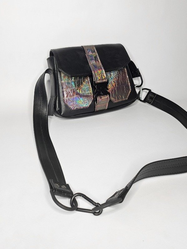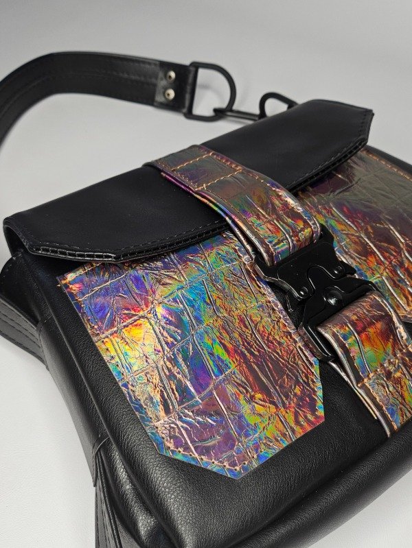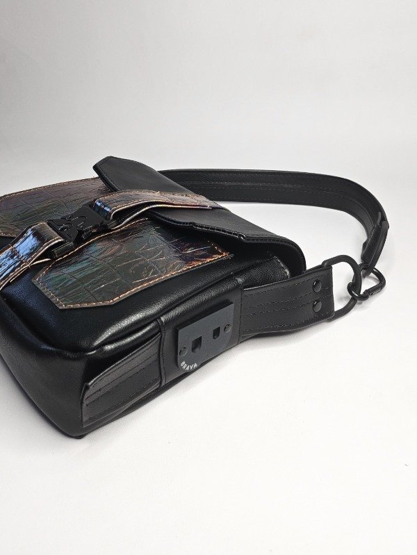Hecha en PU negro liso qué tiene un grosor de 1.8 símilar al cuero. Combinado con PU tornasol. Su interior está forrado con silver impermeable. Cuenta con un bolsillo interno